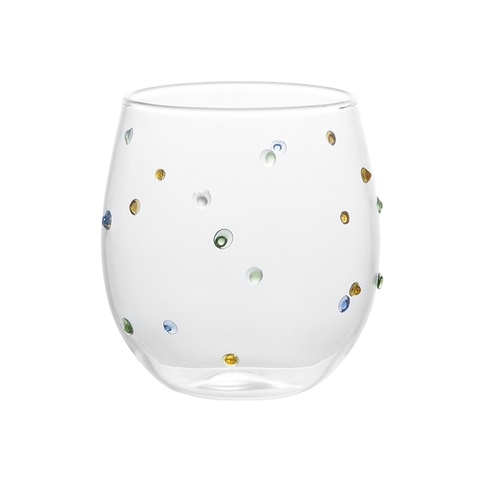色とりどりのドット埋め込みクリアガラスタンブラー、カラフルなアクセントを持つ気まぐれなデザイン。飲み物、家の装飾のための理想